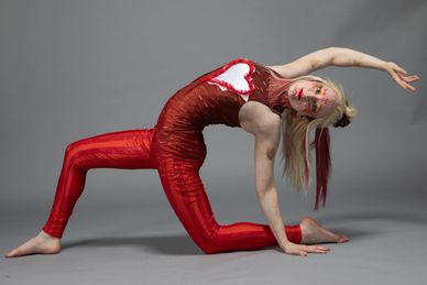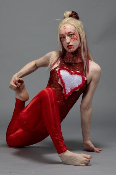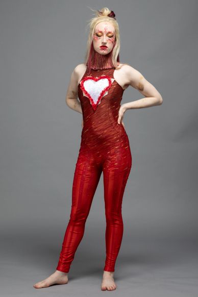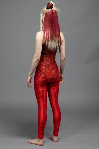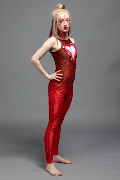 A recreation of a leotard worn by trapeze artists in Cirque Du Soleil's "Kooza." This costume was first worn by Darya Vintilova in 2007 and subsequently worn by other performers in later versions of the show.